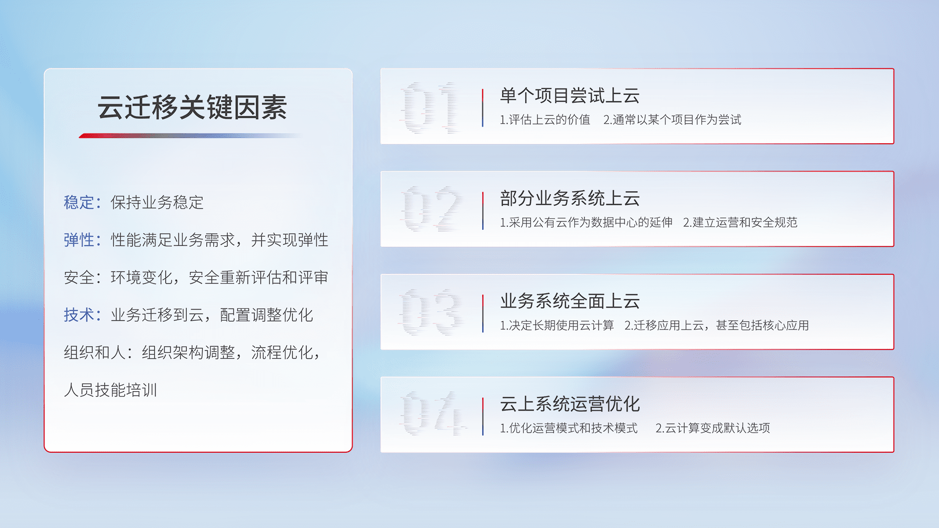 结合实际业务,,从规划设计、、云平台选型、、、云原生改造、、、数据迁移、、、、集成交付,,迁移全过程为客户识别最佳上云路径,,做好风险识别管理,,,,设计网络架构、、身份权限、、、、安全审计合规、、、操作审计、、日志审计、、监控告警策略、、、多站点容灾设计等,,对云上基础设施进行整体规划,,提升IT治理水平,,以满足弹性、、高可用、、、高性能的需求。。。